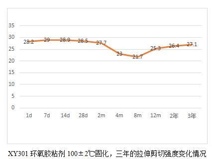 XY304環(huán)氧膠粘劑的耐老化有19.6年的實測數(shù)據(jù)。鑒于現(xiàn)在軍工用膠粘劑品種有新增且部分原材料供貨廠家也發(fā)生了變化,為了真實了解這些材料的耐老化情況,我們將公司的環(huán)氧類型的膠粘劑產(chǎn)品做了一個25年老化的計劃,并于2018年元月開始,預(yù)計整個試驗到2043年結(jié)束。