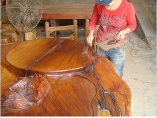 大板(柚木、花梨木、雞翅木、檀木等)在修補(bǔ)前,首先應(yīng)將大板里的水分風(fēng)干,好把木材內(nèi)的含水量控制在6%-12%之內(nèi),并且要將有縫隙和裂紋處的泥沙木屑清理干凈再進(jìn)行灌膠或涂膠修補(bǔ),如果裂縫處底部是相通的,則需要將底部先堵住,待補(bǔ)完膠再打磨掉。這樣修補(bǔ)出來的成品才相當(dāng)平整和美觀.