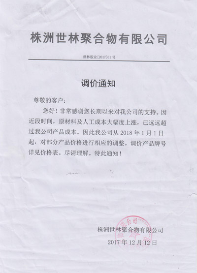 您現(xiàn)在的位置:世林膠業(yè)首頁 - 資訊大全 - 世林膠業(yè)2018年1月調(diào)價通知