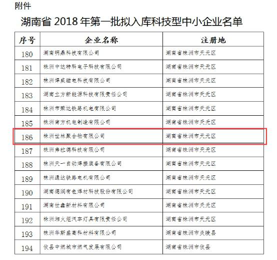 根據(jù)《科技型中小企業(yè)評價辦法》(國科發(fā)政〔2017〕115號)和《科技型中小企業(yè)評價工作指引(試行)》(國科火字〔2017〕144號)有關(guān)規(guī)定,經(jīng)企業(yè)自主評價、評價機(jī)構(gòu)審核,現(xiàn)將湖南省2018年批194家擬入庫科技型中小企業(yè)名單(名單見附件)予以公示,株洲世林聚合物有限公司(世林膠業(yè))也榮獲在內(nèi)。