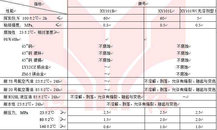 XY101各型密封膏為不干性粘彈型液態(tài)密封墊,它具有耐水、耐水與乙二醇或水與甲醇的混合物,耐汽油、噴氣燃料、礦物油、合成潤滑油、耐渦輪發(fā)動機燃燒產(chǎn)物等,它適合于航空發(fā)動機的附件機匣與壓氣機機匣結合面、附件機匣與附件安裝面等處的密封。也適合于其它發(fā)動機、大型機械或設備的相關部位密封。通常其密封間隙應小于0.04mm。但不適合于大間隙以及薄壁焊接件及沖壓件的結合面密封,也不適于帶坡度的結合面密封。其工作溫度為-50~+250℃,短期可達300℃。